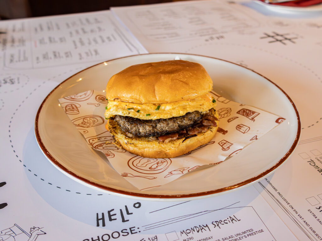 Your main is a choice between a breakfast bun at AED 29, proper and satisfying, or steak and eggs at AED 55 for those mornings that call for something more substantial. Because if anyone was going to put steak on a breakfast menu and make it feel completely natural, it was going to be Rowley’s.